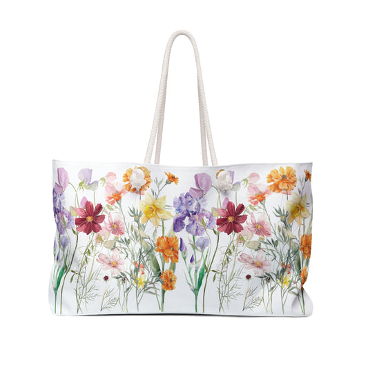 Embrace the beauty of nature with Simply Trendy's Essential’s "Floral Serenity Travel & Beach Bag "design. This enchanting floral artwork features a vibrant array of hand-painted wildflowers in shades of red, yellow, purple, and orange, set against a crisp white background. Delicate watercolor strokes bring each petal and stem to life, evoking a sense of fresh, blooming meadows. Perfect for those who love nature-inspired aesthetics, this design adds a touch of elegance and tranquility to any look